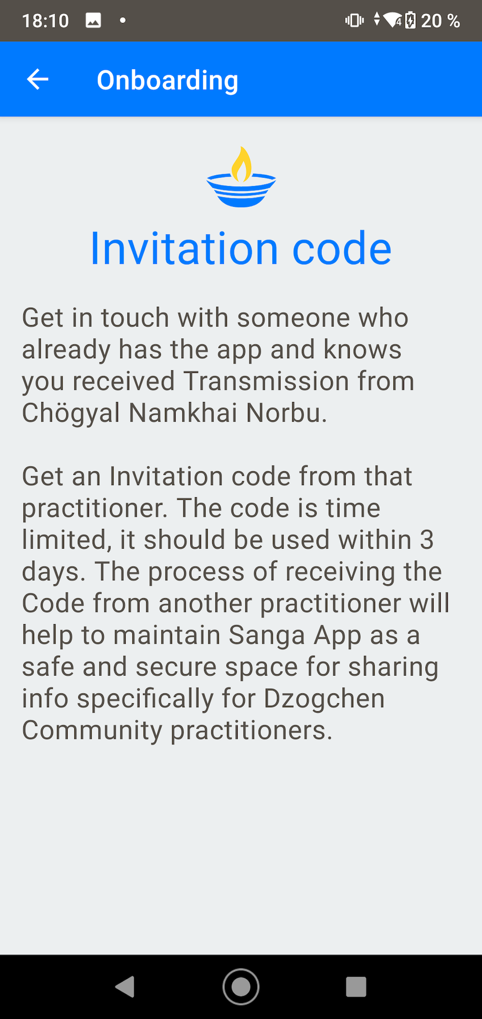 Spoj se s někým, kdo již aplikaci Sangha má a může potvrdit, že jsi obdržel(a) transmisi od Čhögyal Namkhai Norbua. Vyžádej si Zvací kód od daného praktikujícího. Kód má omezenou platnost. Měl by být použit během 3 dnů. Proces získání kódu od dalšího praktikujícího pomůže udržet aplikaci Sangha jako bezpečné a uzavřené prostředí pro sdílení informací specificky pro praktikující Dzogčhenu. |